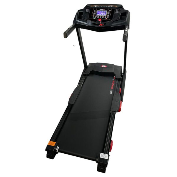 Bieżnia została wyposażona w rolki transportowe, które umożliwią Ci łatwe i wygodne przemieszczenie sprzętu w dogodne miejsce, oraz w specjalny system składania taśmy do pionu dzięki czemu zaoszczędzisz miejsce w pomieszczeniu.