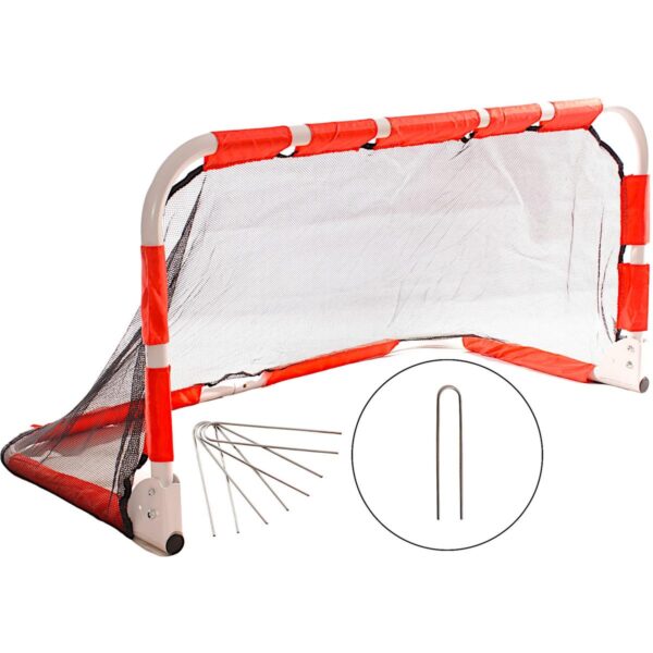 - Zestaw zawiera: składaną bramkę, siatkę, 4 śledzie w kształcie litery U, instrukcję.