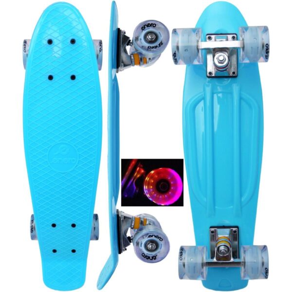 Jazda na deskorolce to sport indywidualny, który daje nie tylko frajdę, ale też poprawia sprawność fizyczną, pobudzając wszystkie mięśnie. Pozwala również, ćwiczyć wytrwałość i cierpliwość. DESKOROLKA ENERO NIEBIESKA LED idealnie posłuży do rozpoczęcia przygody z tym rodzajem sportu oraz do nauki podstawowych trików. Potocznie tego rodzaju deskorolki nazywane są fiszkami. Ich nazwa pochodzi od angielskiego słowa „fish” oznaczającego rybę, z uwagi na ich charakterystyczny kształt i znane są na całym świecie