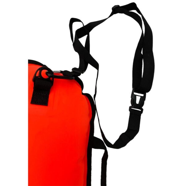 Bojka posiada regulowaną i wytrzymałą linkę do mocowana na pasie, dzięki czemu każdy będzie mieć pewność, że bojka będzie blisko podczas pływania.