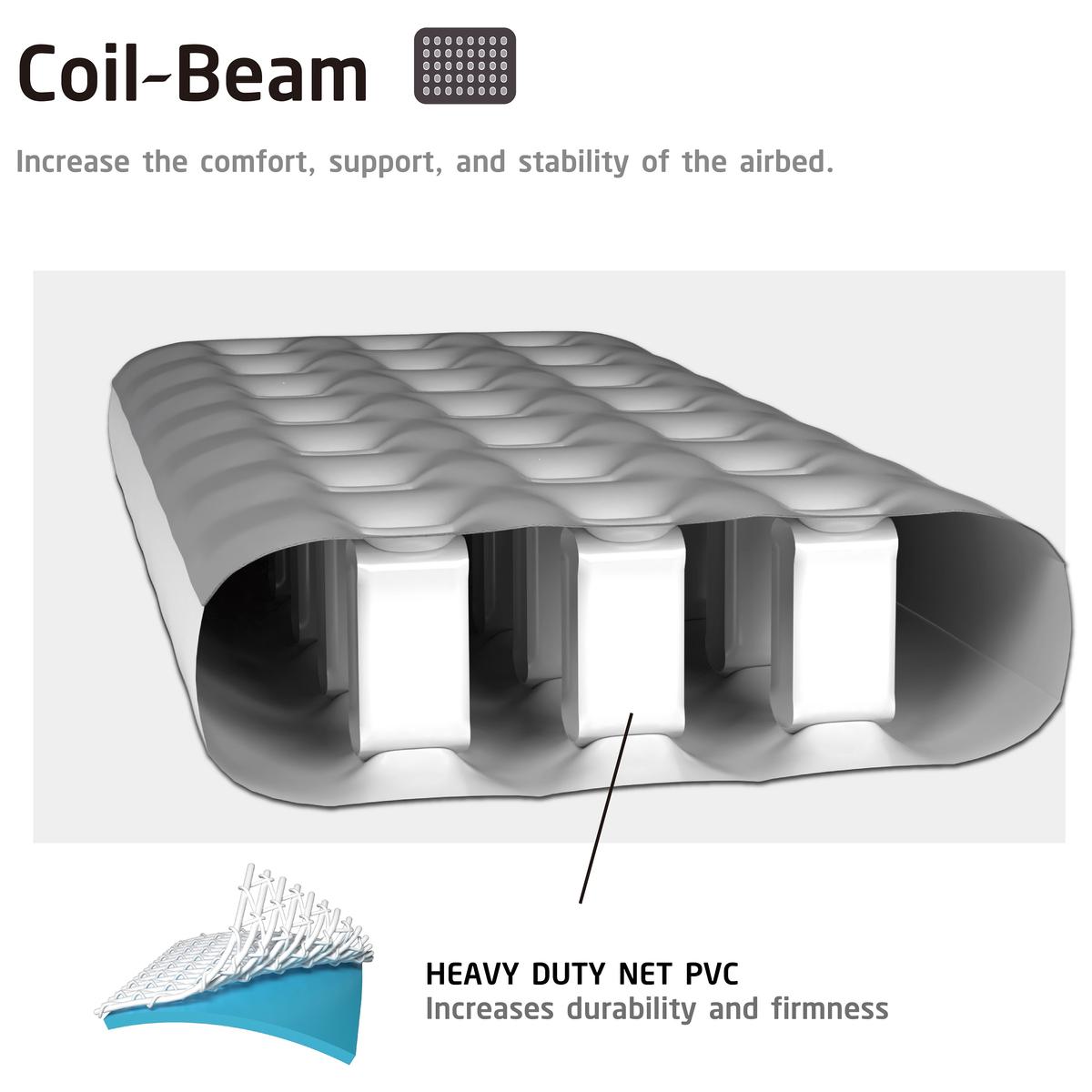 Konstrukcja Coil Beam to doskonałe rozwiązanie dla osób, które oczekują od materaca dmuchanego nie tylko wygody, ale także trwałości i stabilności. Dzięki zastosowaniu pionowych belek, materac oferuje doskonałe wsparcie i komfort podczas użytkowania. Idealny na wyjazdy, do domu, do ogrodu czy na działkę.