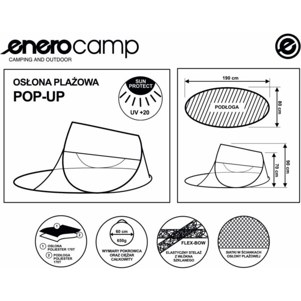 NAMIOTU PARAWANU PLAŻOWEGO SAMOROZKŁADAJĄCEGO SIĘ 190X80X90/70CM ENERO CAMP sprawdzi się podczas wszystkich Twoich wyjazdów nad morze, jezioro czy na biwak. Ten samorozkładający się namiot od ENERO CAMP, to wysokiej jakości produkt o szerokości 80 cm, głębokości 190 cm oraz maksymalnej wysokości 90 cm, spakowany w wygodny pokrowiec ułatwiający jego transport i przechowywanie. Jego stelaż z włókna szklanego charakteryzuje się dużą lekkością i odpornością na uszkodzenia mechaniczne. Pokrycie uszyte zostało z mocnego poliestru 170T, który chroni przed szkodliwym promieniowaniem UV i wiatrem. Po bokach zostały umieszczone liczne wstawki z siatki, które zapewnią wysoką wentylację w samym środku.