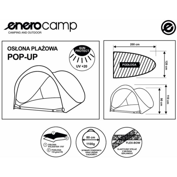 NAMIOT PARAWAN PLAŻOWY SAMOROZKŁADAJĄCY ZAMYKANY 200X120X110/90CM ENERO CAMP sprawdzi się podczas wszystkich Twoich wyjazdów nad morze, jezioro czy na biwak. Ten samorozkładający się namiot od ENERO CAMP, to wysokiej jakości produkt o szerokości 120 cm, głębokości 200 cm oraz maksymalnej wysokości 110 cm, spakowany w wygodny pokrowiec ułatwiający jego transport i przechowywanie. Jego stelaż z włókna szklanego charakteryzuje się dużą lekkością i odpornością na uszkodzenia mechaniczne. Pokrycie uszyte zostało z mocnego poliestru 170T, który chroni przed szkodliwym promieniowaniem UV i wiatrem, a dodatkowe zamknięcie pozwoli zabezpieczyć osobiste rzeczy lub spokojnie zmienić mokry strój na suche ubranie.