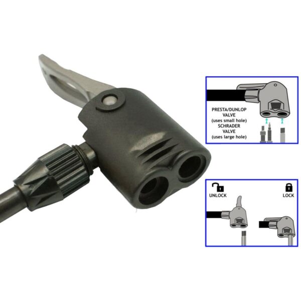 Wężyk posiada specjalny systemem blokowania, który bezpiecznie zamocuje go do zaworu, dzięki czemu powietrze nie ucieka podczas pompowania. Wytrzymały uchwyt i podnóżek sprawiają, że odciąganie jest wygodne nawet przy wysokim ciśnieniu.