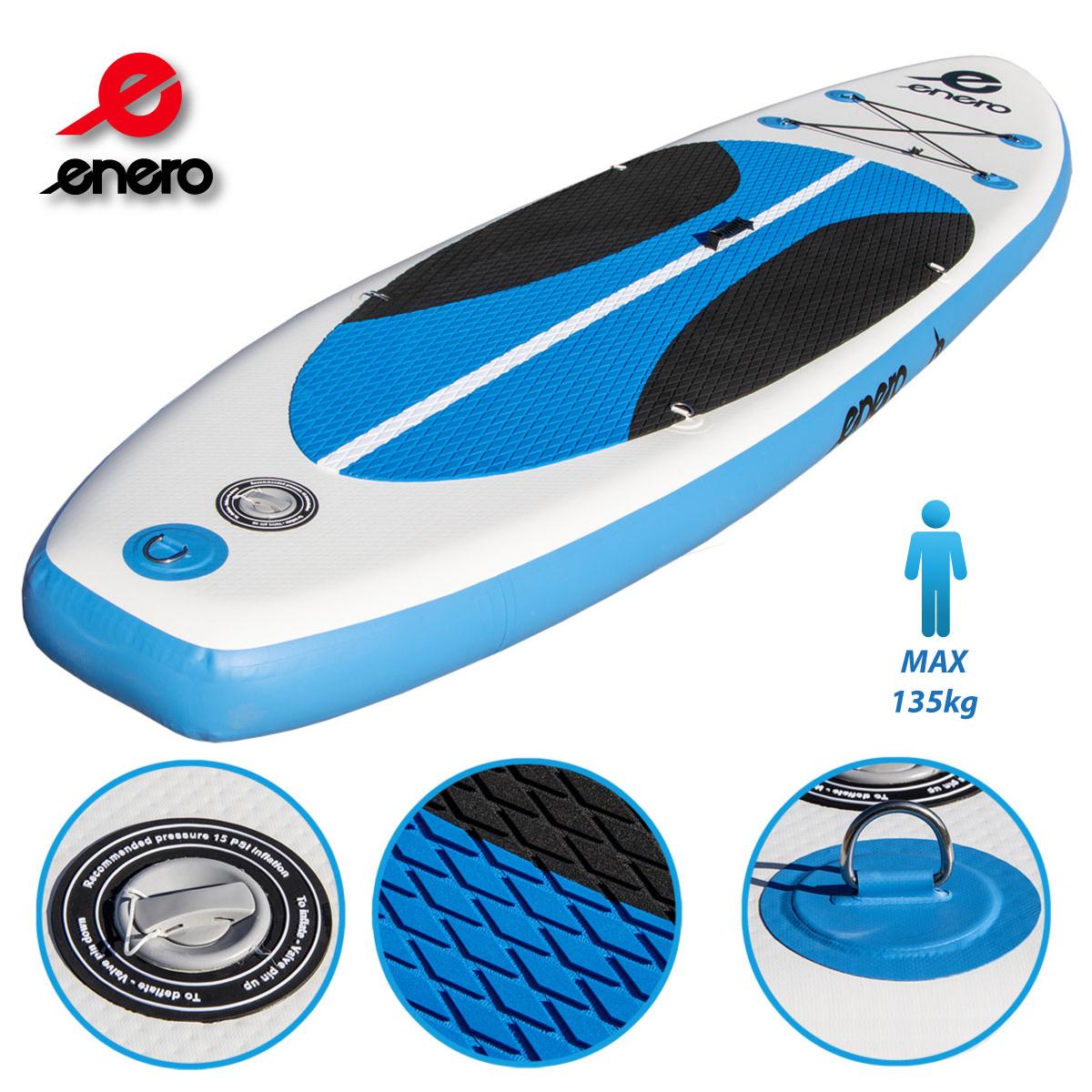 POMPOWANA DESKA SUP MARKI ENERO to idealny wybór na indywidualne lub rodzinne wyjazdy weekendowe, zarówno dla amatorów, jak i dla sportowców. Dzięki dołączonemu do zestawu plecakowi do przechowywania deski nie będziesz mieć problemu z jej przetransportowaniem, zmieści się w każdym bagażniku, a specjalny duży uchwyt z rączką na spodzie deski ułatwi jej przenoszenie. Natomiast dzięki ręcznej pompce wysokociśnieniowej ze wskaźnikiem ciśnienia nie będziesz mieć większych problemów z napompowaniem deski SUP, a niezbędny zestaw naprawczy pozwoli naprawić ewentualne zniszczenia. Specjalne uchwyty pozwolą zamontować Ci krzesło, które możesz dodatkowo zakupić dostępne w naszym sklepie internetowym, a mocne skrzyżowane gumy umieszczone na przodzie deski dadzą możliwość przewiezienia np.: niewielkiego plecaka. W naszej ofercie znajdą Państwo również linkę zabezpieczającą, dzięki której deska nie odpłynie samodzielnie w dal po upadku do wody.