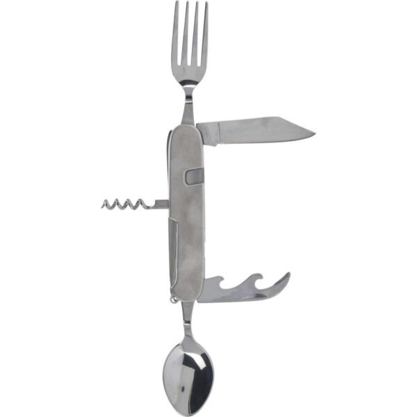 - posłuży jako nóż, otwieracz do butelek, korkociąg, łyżka, widelec, kółko do kluczy
